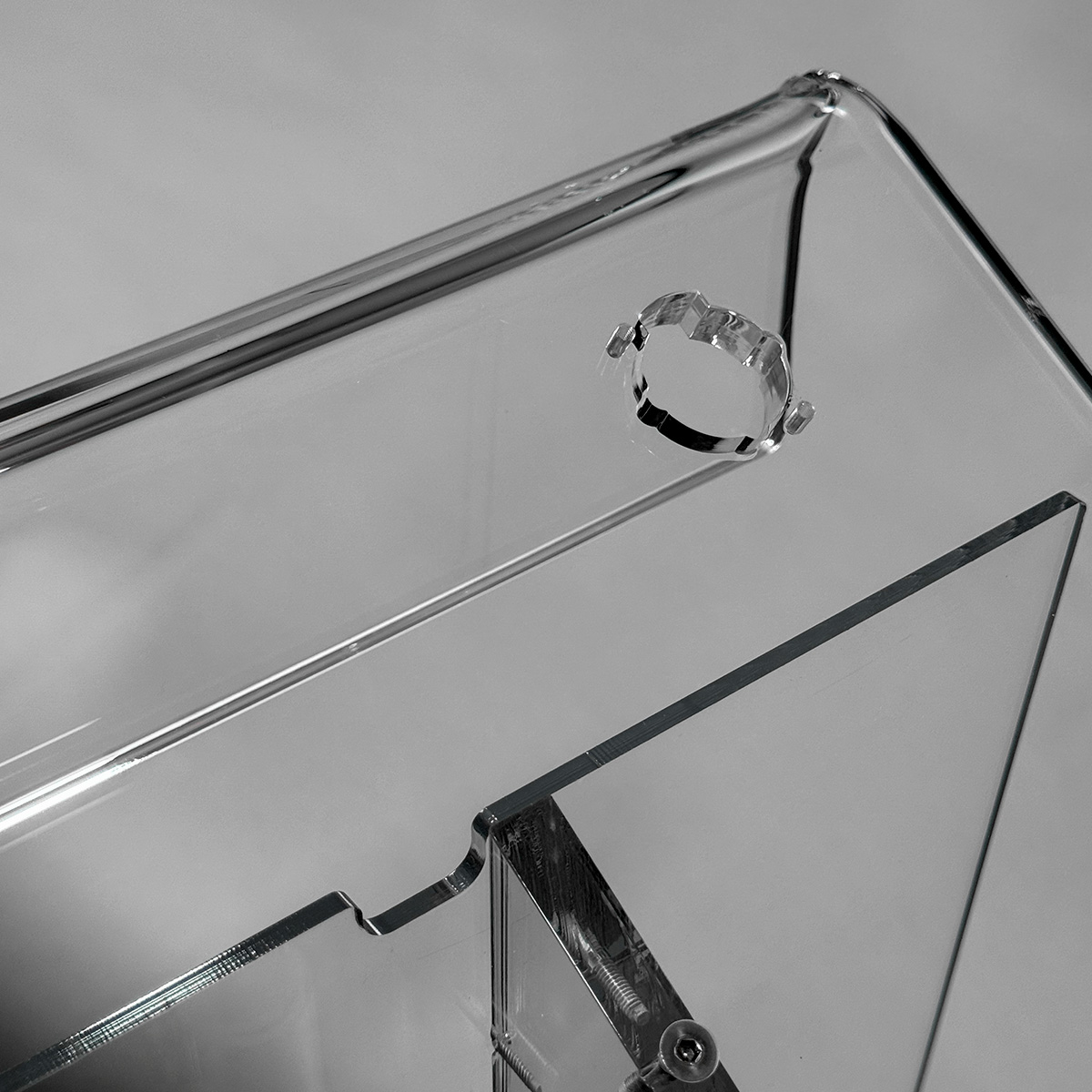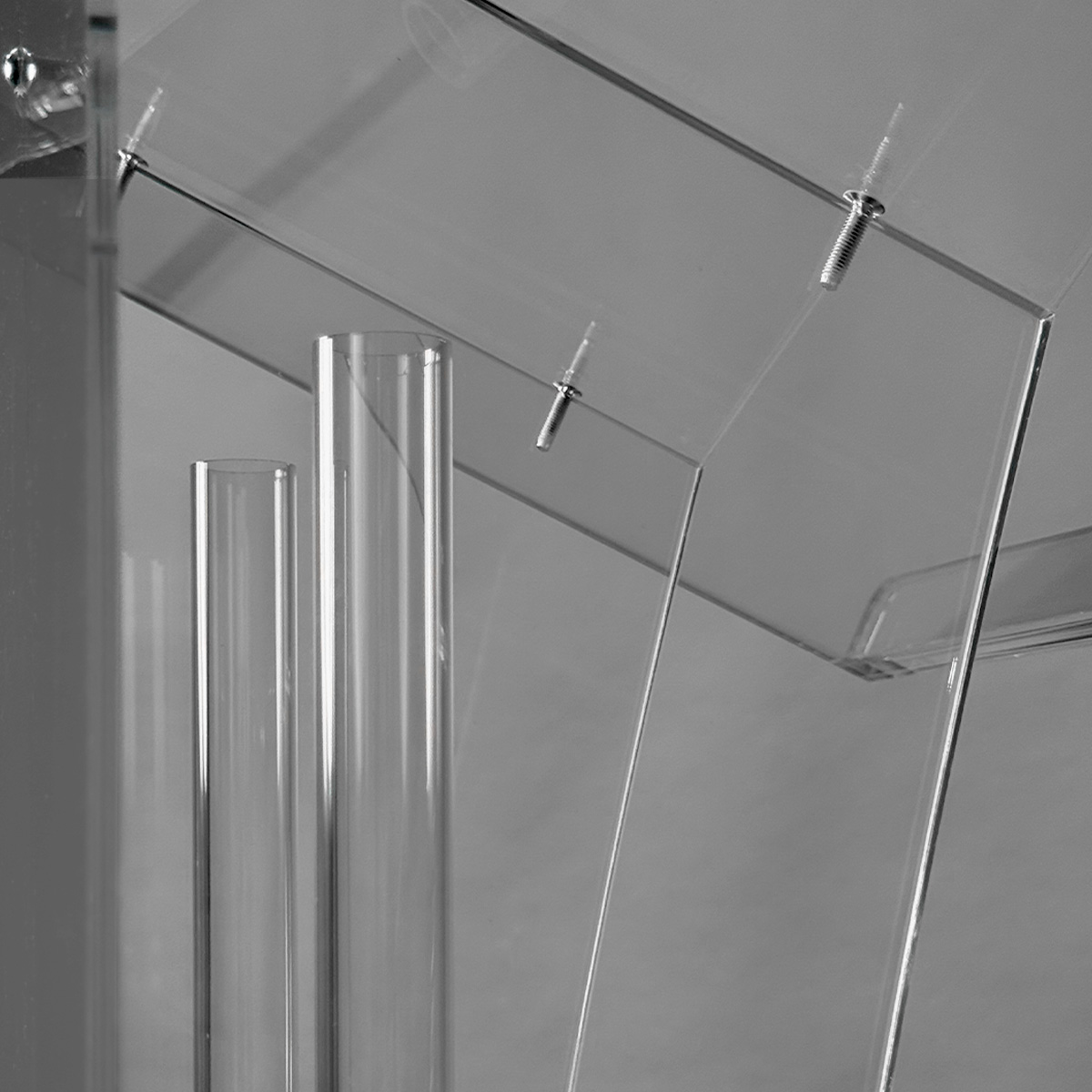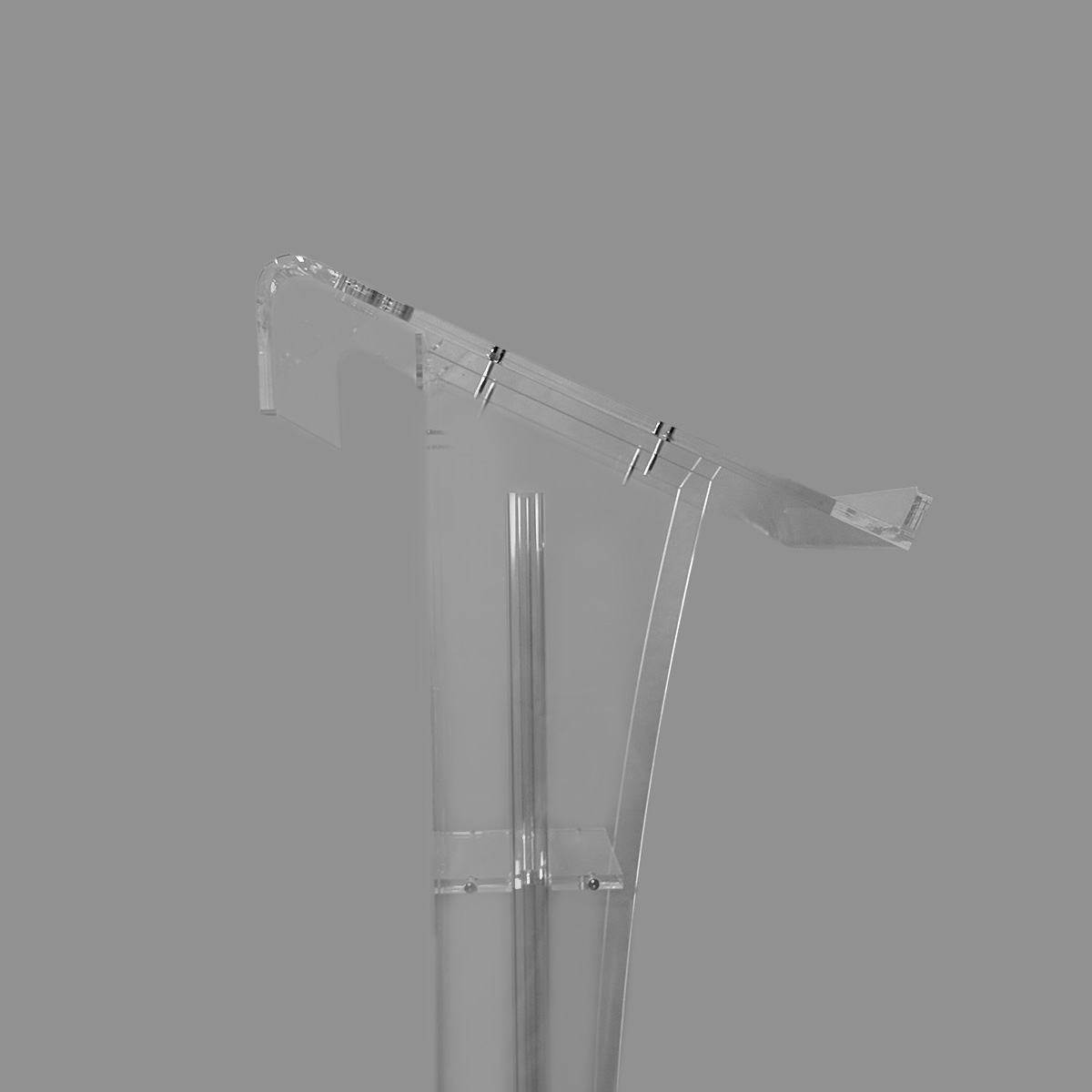 Atril fabricado en metacrilato incoloro de 10 mm de espesor. La parte superior va taladrada para poder incorporar micrófonos con conector de chasis XLR. Es un diseño sencillo y práctico. Se incluyen muecas y tubos para pasar los cables sin dificultad y que quede visualmente estético. Cuenta con una balda y una placa en el frontal para aplicar vinilo removible y personalizar el atril según el evento o las necesidades. Todos los accesorios están atornillados para su fácil desmontaje o sustitución. La base tiene 4 patas en forma de tacos que la protegen de arañazos.