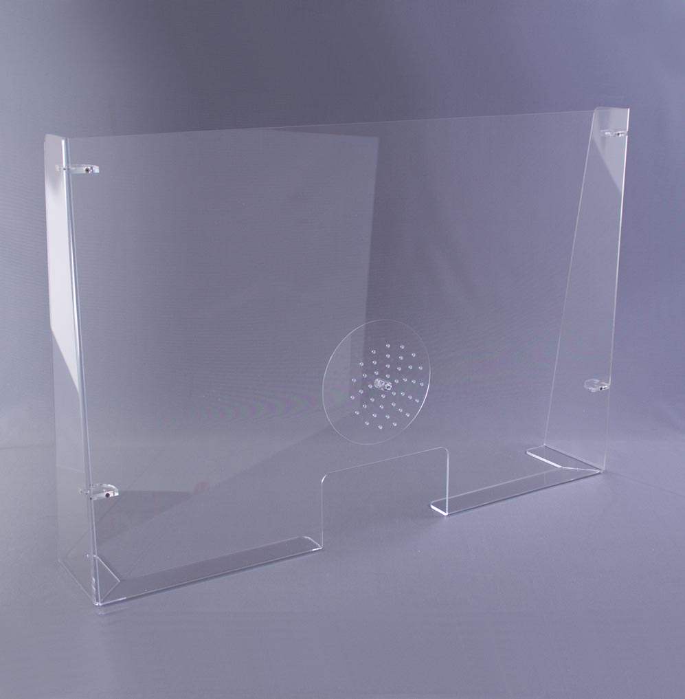 Mampara protectora para mostrador o mesa. Con protección en la parte frontal y en los laterales. Gracias a su transparencia, no impide la visibilidad. Fabricada con metacrilato incoloro de alta calidad. Posibilidad de desmontarla para su fácil transporte y manipulado. Las piezas van atornilladas.