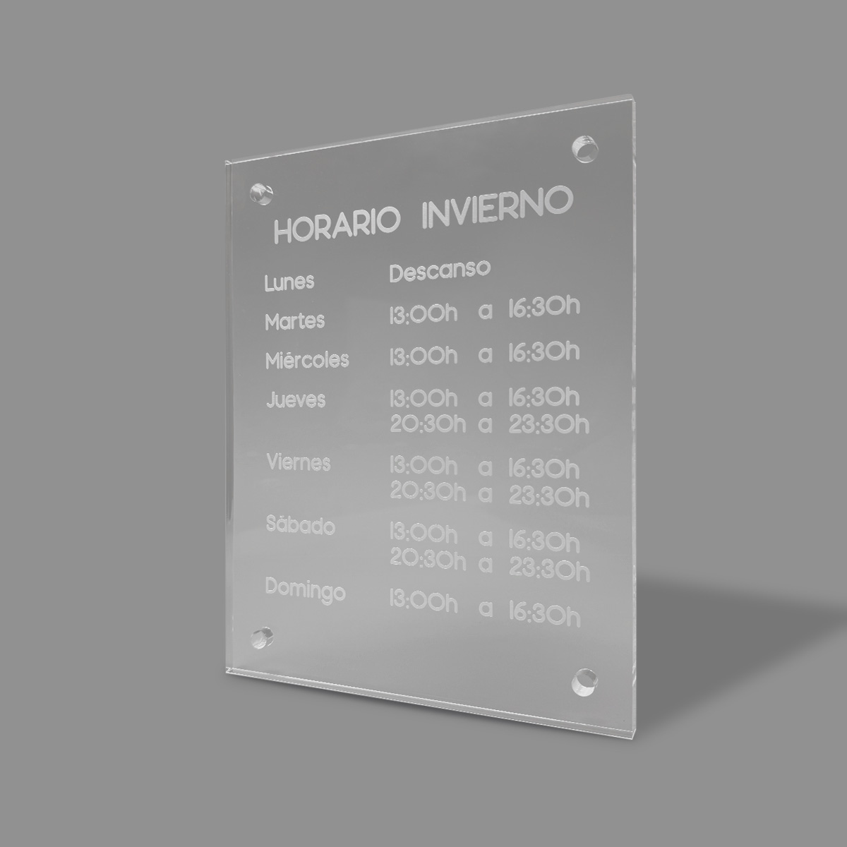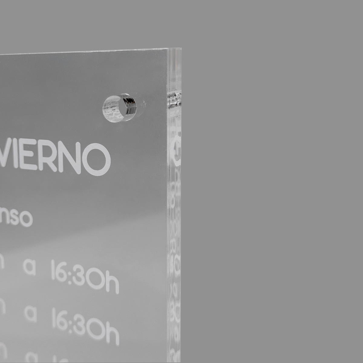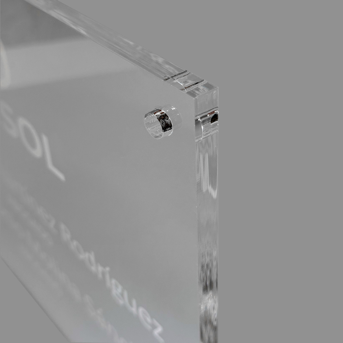 El grabado láser deja el metacrilato desgastado y de color blanquecino. Lo que consigue un resultado elegante y único. El grabado es de gran precisión y quedará marcado de forma imborrable. El fondo de la placa será totalmente incoloro y con una alta transparencia. Grabamos por la parte trasera de la placa, de manera que, al mirarla por la parte frontal, el grabado tomará cierta profundidad dependiendo del espesor. Podrá elegir la posición de la placa horizontal o vertical.